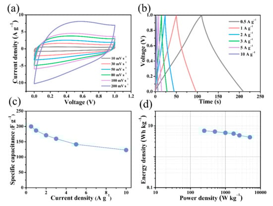 Figure 8 shows the electrochemical performance of the B/S-SCS-1//B/S-SCS-1 symmetric supercapacitor after the introduction of the 6 M KOH electrolyte(The real image of the symmetric device is presented in Figure S9). The CV curves of the prepared B/S-SCS-1//B/S-SCS-1 supercapacitor exhibit quasi-rectangular shapes with no significant deformation, even at a high scanning velocity of 200 mV s−1 (Figure 8a), which suggests a dominant electric double layer, fast charge/discharge process, and satisfactory electrochemistry rate property []. As shown in Figure 8b, the GCD curve exhibited a typical triangle, indicating high capacitance and electrochemical reversibility. From Figure 8c, it can be seen that the B/S-SCS-1//B/S-SCS-1 symmetrical supercapacitor assumed a high specific capacitance of 200 F g−1 at 0.5 A g−1, and when the current density increased to 10 A g−1, it reached a ratio capacitance of 116.4 F g−1, revealing moderate rate performance. The B/S-SCS-1/B/S-SCS-1 supercapacitor has a specific energy of 6.94 Wh kg−1 and specific power of 248.4 W kg−1 (Figure 8d). EIS analysis confirmed the enhanced kinetics of ionic transportation and charge transport in the constructed supercapacitor, as indicated by the Nyquist plot in Figure S5a. The almost vertical lines in the low-frequency area demonstrate the typical electric double-layer capacitor (EDLC) behavior with fast ion diffusion and migration []. At high frequencies, the presence of a full, tiny semicircle substantiates the low charge transfer resistance during the Faraday reaction and EDLC creation [].