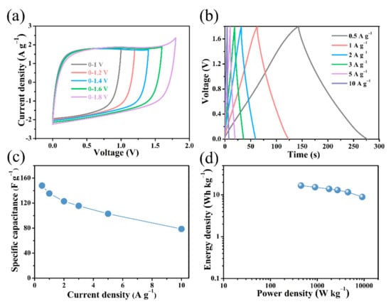 To further explore the practical application of electrode materials in supercapacitors, a prototype of a two-electrode supercapacitor was produced using B/S-SCS-1 in neutral 1 M Na2SO4 solutions. Compared with acidic or alkaline electrolytes, Na2SO4 electrolyte can offer a large voltage window. Since hydrogen and oxygen evolution reactions occur as the voltage increases, this causes a rapid increase in the current at a high potential. The neutral electrolytic liquid phase has less H+ and OH− for acidic and alkaline. In addition, the porous carbon structure provides rich transport and adsorption sites for H+ and OH−, thus inhibiting hydrogen and oxygen evolution reactions [,]. Figure 9a shows the CV measurement performed at 50 mV s−1 for the B/S-SCS-1/B/S-SCS-1 supercapacitor. When the voltage swing increases to 1.8 V, the CV curves basically remain rectangular and symmetrical, with no visible redox peaks, showing ideal capacitance behavior.