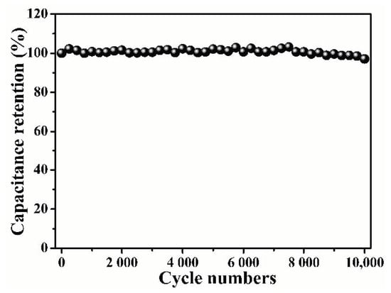 Figure 9b reveals the perfect symmetry and outstanding reversibility of the GCD curve. Based on the discharging time, the specific capacitances were estimated to be 142 F g−1 at the current density of 0.5 A g−1 (Figure 9c). The results show a downward trend with the increase in the current density. Based on the specific capacitance value and high-voltage operating range, Figure 9d shows the Ragone diagram of the B/S-SCS-1//B/S-SCS-1 symmetric supercapacitor. It exhibits maximum specific energy of 16.65 Wh kg−1 at a specific power of 450 W kg−1 in the B/S-SCS-1//B/S-SCS-1 symmetrical supercapacitor, which is considerably higher compared to the previously reported carbon-based symmetric supercapacitors (Table 3). The samples prepared using this method can achieve a more balanced and outstanding performance with respect to capacitance, specific energy, and specific power. The cycling stability of B/S-SCS-1 was investigated, as shown in Figure 10, and the capacitor retention of the B/S-SCS-1 electrode was around 97.09% posterior to 10,000 cycles at the current density of 10 A g−1. The results indicate that the prepared B/S-SCS-1 could produce an excellent longtime cyclic performance, it may be related to the variation of the doping content []. Figure S5b presents the Nyquist plots of B/S-SCS-1//B/S-SCS-1. Apparently, the curve is presented as an almost-vertical line at low frequency, which implies the excellent performance of the electrochemical capacitor. Moreover, the smaller semicircle of B/S-SCS-1//B/S-SCS-1 suggests a high ionic diffusion–transference velocity [].