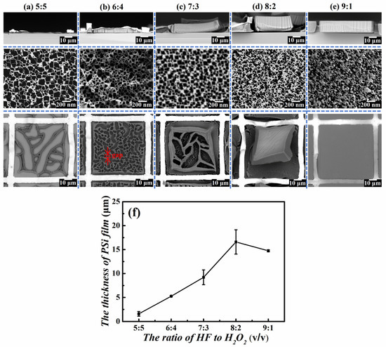 SEM images (top: cross-sectional view, middle: high resolution of top view, bottom: top view) of a patterned Si etched in different R (a) 5:5, (b) 6:4, (c) 7:3, (d) 8:2, and (e) 9:1 for 30 min, respectively. (f) The thickness of PSi film as a function of the R.