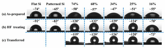 The surface wettability of as-prepared PSi films before and after transfer was investigated by measuring the water contact angle (CA). Figure 4 shows the apparent water droplet CAs on various surfaces, including flat Si substrates, patterned Si substrates covered with Ag film, as-prepared PSi films, PSi films with HF treatment, and PSi films after transfer. These films were prepared under the same conditions as those of Figure 2a–e, respectively, and thus showing porosity in the range of 74–16%.