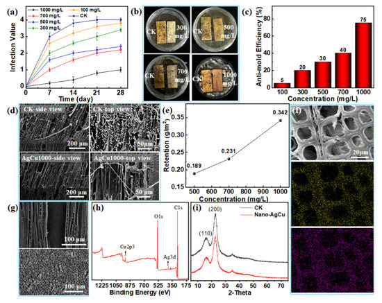 Inhibition effect of the nano-AgCu-treated wood at different concentrations against Aspergillus niger growth on polar wood: (a) Variations of infection value of different wood surfaces with the mold growth time; (b) digital photos of different wood surfaces against mold growth after 28 days; (c) variations of anti-mold efficiency of different wood surfaces after 28-day mold growth. (d) SEM images of different wood surfaces after fungus infection; (e) variations of nano-AgCu retention on wood surface at different concentrations; (f) SEM-EDX images of the cross section of nano-AgCu-treated wood at a concentration of 1000 mg/L; (g) SEM images of the wood longitudinal surface loaded with nano-AgCu at a concentration of 1000 mg/L; (h) XPS spectra of nano-AgCu particles; (i) XRD patterns of CK wood and the nano-AgCu (at a concentration of 1000 mg/L) loaded wood surface.