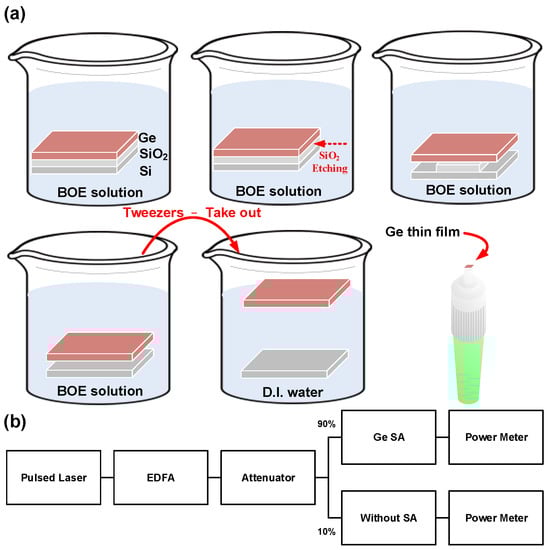 For material and structural analyses, the thickness, structural phase, crystallinity, and chemical composition of the PECVD-grown Ge thin-film were analyzed by a field emission scanning electron microscopy (FESEM, JEOL JSM-7001F, Tokyo, Japan), Raman scattering spectroscopy with a continuous-wave argon laser source at 514.5 nm, and a field emission transmission electron microscopy (FETEM, JEOL JEM-2100, Tokyo, Japan). The spectral resolution of the Raman spectrometer was set as 0.75 cm−1 in this work. In addition, both the linear and nonlinear transmittances were measured via a commercial mode-locked fiber laser with a central wavelength of 1570 nm, a pulsewidth of 715 fs, and a repetition time of 24.7 ns. The output mode-locked pulse was further amplified by a commercial EDFA and then attenuated by a programmable attenuator by adjusting its output power during intensity-dependent measurements. Regarding the SA sample preparation, the chemical exfoliation process of the Ge thin-film is illustrated in Figure 2a. In the exfoliation process, the Ge thin-film was immersed into the BOE solution to etch out the SiO2 layer. The chemical lift-off of the SiO2 layer sandwiched between the epitaxial Ge film and Si wafer was implemented in BOE solution. The BOE solution comprised 40% ammonium fluoride (NH4F) and 49% hydrofluoric acid (HF). In addition, the NH4F/HF ratio was controlled at 6:1. Subsequently, the floated Ge-film was transferred to the fiber patchcord after gradually diluting the BOE solution with the deionized water. Such a specific transfer procedure naturally generated a native oxidized layer with a thickness of less than 10 nm on the Ge surface, which was dipped in the deionized water afterwards to prevent further surface oxidation. Then, the Ge film was transferred from the Si substrate to the deionized (D.I.) water surface. After diluting the residual acid solution, the floating Ge thin-film was attached to the end-face of an FC/APC connector at the end of the SMF patchcord by simply dipping an SMF patchcord into the D.I. water tank with the floated Ge thin-film. Finally, the SMF patchcord with wet Ge thin-film attached to its end-face was baked in an oven at 120 °C for 10 min and naturally dried under room temperature for about 24 h. Then, an optical coupler with a coupling ratio of 10%/90% was used to couple the 90% light into the SMF patchcord with sandwiched the Ge thin-film SA. In contrast, the 10% light was sent into another SMF patchcord without SA for reference, as shown in Figure 2b. Lastly, the performance of the EDFL pulse, mode-locked by the Ge-thin-film-based SA, was analyzed by an optical spectrum analyzer (OSA, Ando, AQ6317B, Kawasaki, Japan) and an intensity autocorrelator (Femtochrome, FR-103XL, Berkeley, CA, USA).