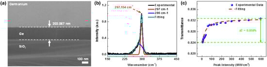 The FESEM image of the PECVD-grown germanium thin-film is shown in Figure 3a. The thickness of the Ge layer deposited upon a 3-μm-thick SiO2-coated Si substrate was estimated as 203.07 nm. With a near-threshold plasma power during PECVD growth, the deposition time was as long as 15 min for smooth and slow Ge deposition. This deposition rate was as low as 13.5 nm/min at a substrate temperature of 100 °C. For structural analysis, the Raman spectroscopy was implemented to measure the crystallinity of the deposited Ge layer, as shown in Figure 3b. After exciting the surface via an argon continuous-wave (CW) laser at 514.5 nm, the Raman scattering peak of the deposited Ge layer was located at 297.15 cm−1 at room temperature [50,51]. This relatively sharp peak with a huge intensity was comparable with the standard crystalline Ge reference centered at 300 cm−1. This result indicates the high level of crystallinity for the low-temperature PECVD-grown Ge layer. One Raman scattering peak at 297 cm−1 originated from the transverse-optical (TO) mode of the crystalline Ge [52], and nanocrystalline Ge contributed to another Raman scattering peak at 286 cm−1 [53]. For the Ge deposited on the SiO2/Si substrate, the slight deviation of 3 cm−1 was red-shifted from the standard reference at 300 cm−1. The deposited Ge film on SiO2/Si substrate still suffered from a slight strain [50,51]. Subsequently, the nonlinear optical properties of the Ge film on SiO2/Si were lifted off and investigated by utilizing a commercial mode-locked fiber laser with continuously varying illumination power on the sample surface. As a result, the nonlinear transmittance T of the lift-off Ge film is shown in Figure 3c, which can be fitted by using the following equation [24,29,54]: