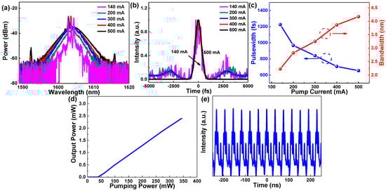 (a) Autocorrelated traces and (b) corresponding optical spectra of the mode-locked pulse self-started by the Ge-based SA. (c) Pulsewidth and bandwidth of the mode-locked pulse self-started by the Ge-based SA under different pumping currents. (d) P–I curve and (e) pulse train of the mode-locked pulse self-started by the Ge-based SA.