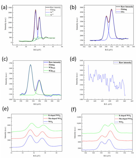 - Xie, F.Y.; Gong, L.; Liu, X.; Tao, Y.T.; Zhang, W.H.; Chen, S.H.; Meng, H.; Chen, J. XPS studies on surface reduction of tungsten oxide nanowire film by Ar+ bombardment. J. Electron. Spectros. Relat. Phenomena 2012, 185, 112–118. [Google Scholar] [CrossRef]