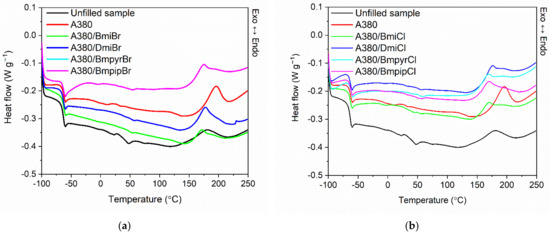Differential scanning calorimetry (DSC) curves of the silica-filled NR compounds containing ILs with: (a) bromide anion; (b) chloride anion.