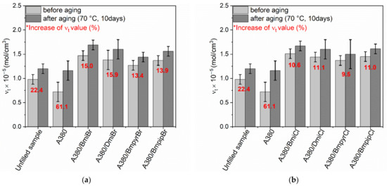 Additionally, to more accurately illustrate the differences between crosslink density before and after the aging process, the value of the crosslink density increase (%) given by Equation (4) was calculated.