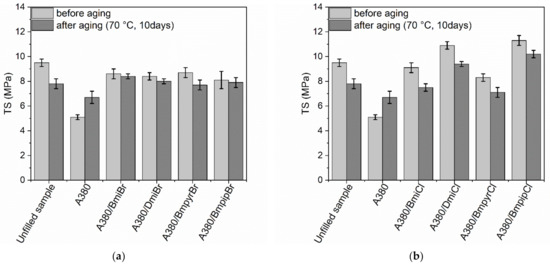 Prolonged exposure to elevated temperatures deteriorated the TS of both the unfilled benchmark and the silica-filled vulcanizates containing ILs. Further crosslinking, induced by the thermo-oxidative aging process, resulted in these vulcanizates being over-crosslinked and thus brittle and less resistant to mechanical stress [74]. The structure—and, more precisely, the type of anion—of ILs affected the changes in TS due to the thermo-oxidative aging. Vulcanizates with ILs bearing bromide anion, especially those containing imidazolium cation, showed significantly smaller changes in TS (Figure 6a) as compared to vulcanizates containing ILs with chloride anion (Figure 6b). On the other hand, the silica-filled vulcanizate without ILs exhibited considerably higher TS after prolonged thermo-oxidation compared to non-aged vulcanizate. It should be noticed that this vulcanizate exhibited a significantly lower νt before aging compared to other vulcanizates. Thus, further crosslinking of this vulcanizate during thermo-oxidative aging did not result in over-crosslinking but improved the TS of the material. It is commonly known that the TS of the vulcanizates, which are not over-crosslinked during vulcanization, increases when the crosslink density increases [66].