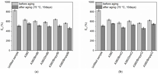 Most of the silica-filled vulcanizates exhibited approximately 100% lower Eb (Figure 7) as compared to non-aged vulcanizates. This was due to the increase in their crosslink density resulting from thermo-oxidative aging. On the other hand, the thermo-oxidative aging process had a great influence on the Eb of the unfilled benchmark, which exhibited approximately 300% lower Eb compared to the non-aged sample. The addition of ILs and their structure did not significantly affect the changes in Eb resulting from thermo-oxidative aging.