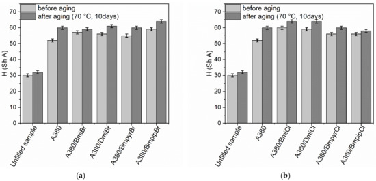 Influence of thermo-oxidative aging on the hardness of the silica-filled NR vulcanizates containing ILs with: (a) bromide anion; (b) chloride anion.