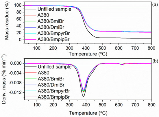 TG analysis was performed in two stages. The first stage of measurements was performed in a temperature range of 25–600 °C in an inert gas-argon. Thus, a pyrolysis of elastomer and other organic components of NR composites, i.e., stearic acid, vulcanization accelerator and ILs, proceeded in this stage. The mass loss at 25–600 °C for the unfilled vulcanizate was of approximately 94.6%, significantly higher than for the silica-filled vulcanizates (mass loss of approximately 75.2%). This resulted from the higher rubber content in the same amount of rubber compound compared to vulcanizates filled with 30 phr of the nanosized silica. Vulcanizates containing ILs were characterized by a mass loss similar to the silica-filled vulcanizate without the ionic liquid. The next stage of measurement was performed in a temperature range of 600–800 °C in an air atmosphere; so, combustion of the residue after thermal decomposition of the vulcanizates proceeded in this stage with a mass loss of approximately 2%. The residue after thermal decomposition of the material at 800 °C was dependent on the composition of the NR composite. Regarding the unfilled benchmark, the residue at 800 °C was 4.2%, which mainly resulted from the use of zinc oxide as a vulcanization activator. Considering vulcanizates filled with nanosized silica, the residue at 800 °C was due to the presence of both zinc oxide and nanosized silica. Regardless of the composition of the silica-filled vulcanizates, the residue at 800 °C was approximately 22%, because the amount of activator and nanosized silica used was the same in all composites.