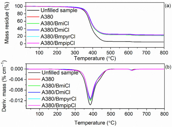 Thermogravimetric (TG) measurements were performed to study the influence of ILs on the thermal stability of NR vulcanizates. A thermogravimetry/differential scanning calorimetry TGA/DSC1 analyzer (Mettler Toledo, Greifensee, Switzerland) was used to conduct measurements for NR vulcanizates. Before measurement, a small piece of each vulcanizate with a mass of approximately 10 mg was placed in the open alumina crucibles with a capacity of 70 µL. Measurements were carried out using two measuring segments. In the first segment of measurement, the specimen was heated in a temperature range of 25–600 °C in argon atmosphere (50 mL/min) with a heating rate of 20 K/min. In the second measuring segment, the gas was changed into air (50 mL/min), and heating was continued up to 800 °C with the same heating rate.