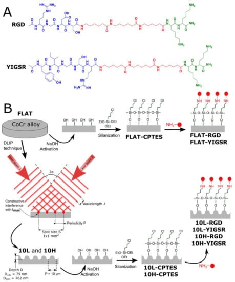 - Mas-Moruno, C.; Fraioli, R.; Albericio, F.; Manero, J.M.; Gil, F.J. Novel Peptide-Based Platform for the Dual Presenta-tion of Biologically Active Peptide Motifs on Biomaterials. ACS Appl. Mater. Interfaces 2014, 6, 6525–6536. [Google Scholar] [CrossRef]