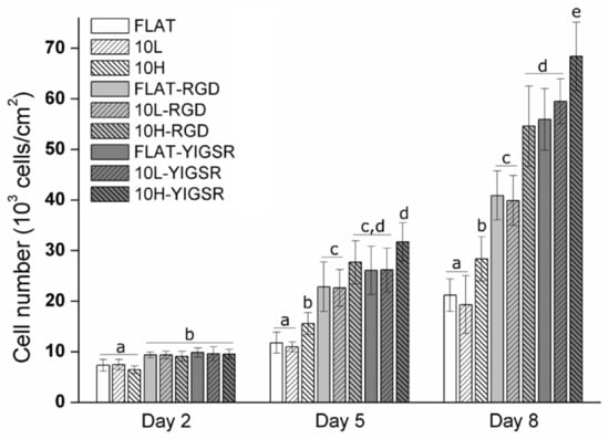 - Csaderova, L.; Martines, E.; Seunarine, K.; Gadegaard, N.; Wilkinson, C.D.W.; Riehle, M.O. A Biodegradable and Biocompatible Regular Nanopattern for Large-Scale Selective Cell Growth. Small 2010, 6, 2755–2761. [Google Scholar] [CrossRef]
