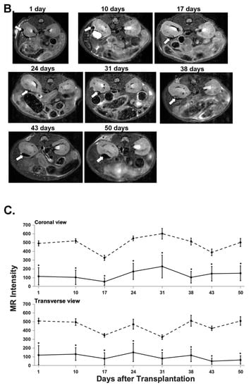 - Juang, J.H.; Shen, C.R.; Wang, J.J.; Kuo, C.H.; Lin, M.Y.; Wu, S.T.; Tsai, Z.T.; Yen, T.C. Magnetic resonance imaging study of mouse islet allotransplantation. Transplant. Proc. 2010, 42, 4217–4220. [Google Scholar] [CrossRef] [PubMed]