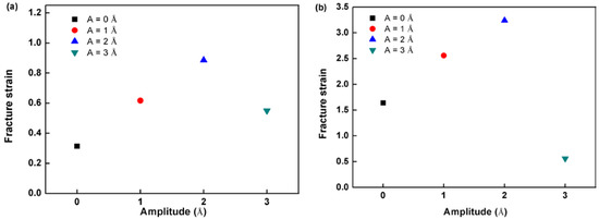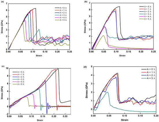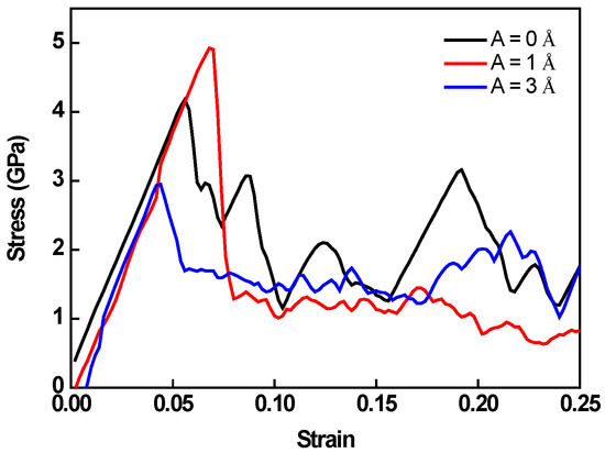 In this subsection, the effect of a notch on the deformation mechanism is considered. Crystal O#1 (X-[100] Y-[011] Z-[0-11]) is used for simulations, and a notch is pre-aligned in the X-direction. The strain rate is set as 109 s−1. The stress–strain responses for different amplitudes are plotted in Figure 10. Unlike previous trends, the largest peak stress is seen at A = 1 Å. The peak stress of the monotonic test is 4.17 GPa, whereas A = 1 Å has a peak stress of 4.92 GPa. Hereafter, the peak stress drops quickly as amplitude rise to 3 Å.