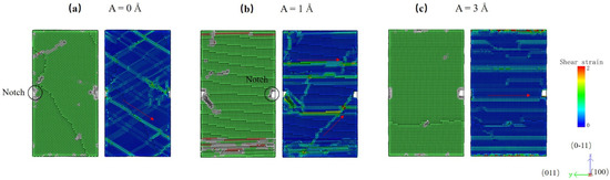 Atomic configuration and shear strain distribution of specimens with a preset notch under HFVs at peak stress, (a) A = 0 Å, (b) A = 1 Å, and (c) A = 3 Å.