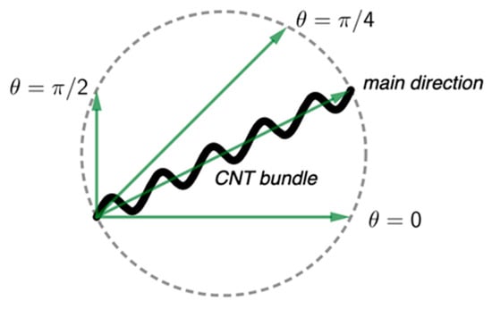 We quantified the CNT bundle orientation using persistent homology [27], where the data features (i.e., the CNT bundle extensions in certain directions) were summarized in an algebraic way and expressed in visible barcodes. An easy observation is that the nanotube bundles at different depths tend to overlap or intersect with each other, and they spread or expand longer in the alignment direction, as depicted in Figure 1. Particularly, we scanned the SEM images of the CNT bundle network back and forth in any given direction, which generated two different 1D-parameterized organizations of each image, known as the sub-level set filtration and super-level set filtration of the projection map. Innovatively, we combined the information encoded in the barcodes of both filtrations to more precisely determine the total CNT bundle variations. One of the most prominent advantages of this work is that the total extensions of all bundles in an SEM image were summarized and analyzed together to demonstrate the overall alignment fraction.