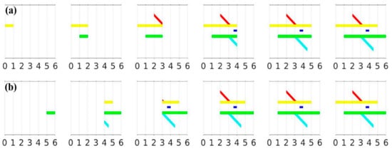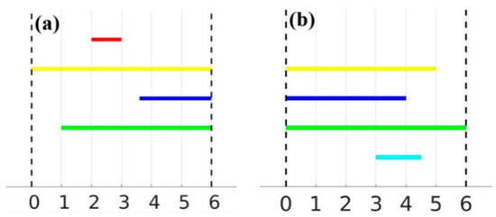 Derived from the sub- and super-level filtrations, Figure 4 presents the persistence barcodes for {Xt}0≤t≤6 and {Xt}0≤t≤6, respectively. The barcodes can be visualized as collections of bars or intervals showing the evolution of the filtration from a horizontal perspective. The number of bars over t is equivalent to the number of components in Xt accordingly; for 0 ≤ t ≤ 1, only one component was observed, resulting from the yellow bundle shown in Figure 2c. For t = 1, a new green bar was born due to the emergence of the green branch, followed by the birth of a red bar at t = 2. For t = 3, the red bundle merged with the yellow one, which decreased the number of components to two. At t = 3.5, a new blue bar was born due to the emergence of the blue branch, and it remained until t = 6, since the blue branch never merged with other branches. A more rigorous mathematical explanation for this convention may be found in [32,33]. Note that the cyan branch of X never contributed a new bar since it was always connected to the green one for any t ≥ 3. Similarly, the barcode for the super-level set filtration of X was constructed as illustrated in Figure 4b. It is worth mentioning that the color associated with the corresponding branches in X is only for visualization purposes. Barcodes, in general, do not provide that information.