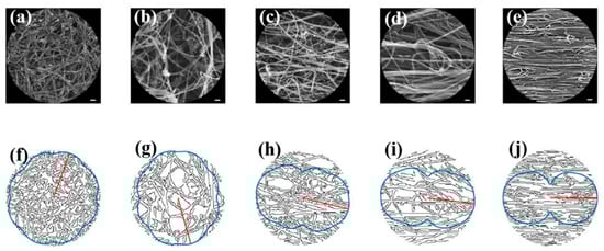 (a–e) The original SEM images for the 0%, 10%, 20%, 30% and 40% stretched CNTs, respectively, under the accelerating voltage of 10 kV at the magnification of ×50,000. Scale bar: 100 nm. Reprinted with permission from Ref. [28], 2014, WILEY. (f–j) depict the output of the Canny edge detector, with the red segments showing the preferred direction and the blue curves showing the evolution of .