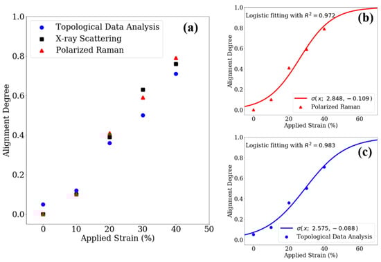 (a) The degree of alignment extracted from polarized Raman spectroscopy, X-ray scattering and topological data analysis; the logistic fitting curves of (b) polarized Raman spectroscopy and (c) TDA.