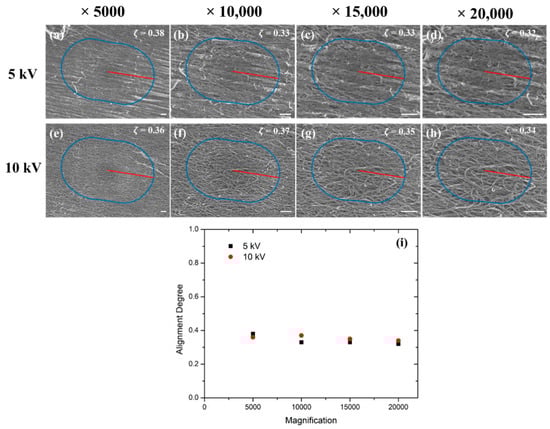 (a–d) SEM images of the 20% stretched CNTs under the acceleration voltage of 5 kV with the magnifications of ×5000, ×10,000, ×15,000 and ×20,000, respectively; (e–h) SEM images of the 20% stretched CNTs under the acceleration voltage of 10 kV with the magnifications of ×5000, ×10,000, ×15,000 and ×20,000, respectively; (i) the calculated alignment degree. Scale bar: 1 μm.