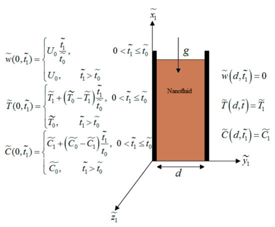 Initially, at ( and ), the temperature, velocity and concentration are uniformed. At the temperature, velocity and concentration of the left wall varies temporarily to , and , respectively. After the system regains its original position (see Figure 1). Thermo-physical features of CNTs and fluids are assumed constant and shown in Table 1.