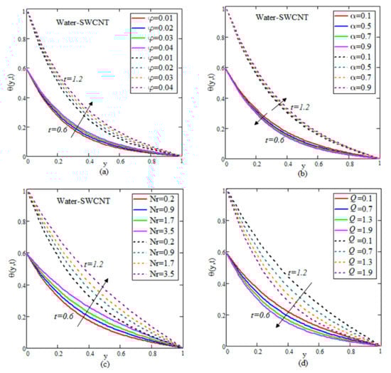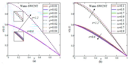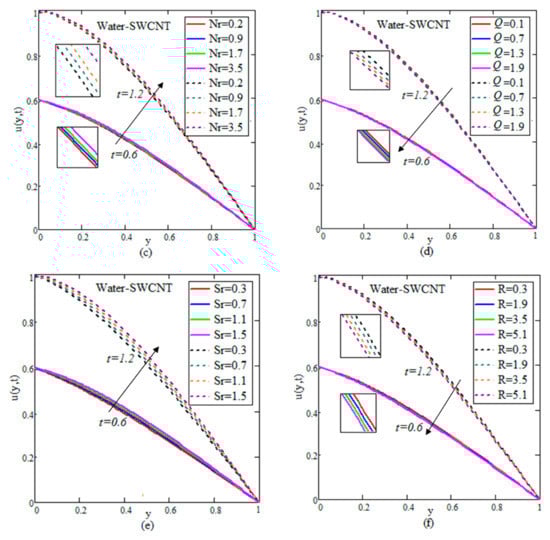 The results for velocity, concentration and temperature profiles are calculated for diverse flow restrictions such as and Q. The velocity, concentration and temperature fields are graphically shown in Figure 2, Figure 3, Figure 4, Figure 5 and Figure 6 to investigate the physical elements of the problem. The impact of on the rate of change of flow, mass and temperature are shown in Table 2, Table 3 and Table 4. It is worth noting that the ramped and isothermal boundary conditions are set at and respectively. For the entire discussion of graphs and tables, we used and excluding the deviation in relevant figures. Figure 2, Figure 3 and Figure 4 show the variation of water–SWCNT.