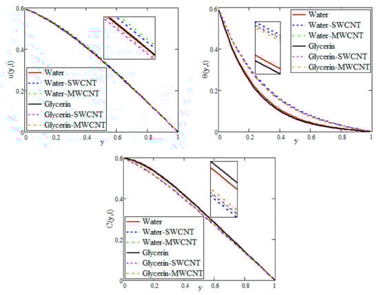 Figure 5 illustrates the comparison of water, water–SWCNT, water–MWCNT, glycerin, glycerin–SWCNT and glycerin–MWCNT velocities, temperatures and concentrations under the ramped boundary conditions. For ramped conditions, water–MWCNT has the maximum velocity, while glycerin–SWCNT has the lowest velocity. Because of the increase in thermal conductivity, the temperature profile of water–SWCNT is higher than the other fluids. Glycerin–MWCNT has a greater concentration than the other fluids under study.