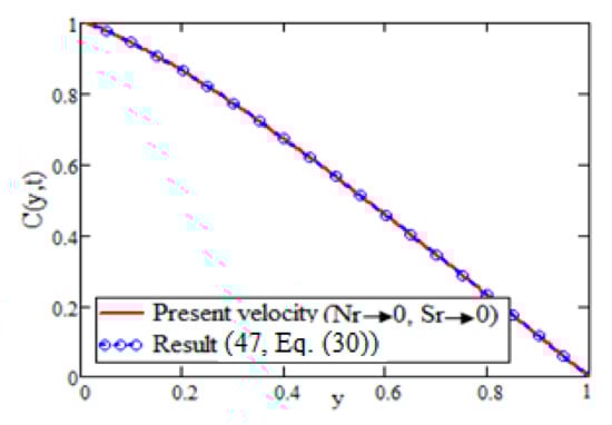 Figure 6 shows that our obtained results are identical to those obtained in [], in the absence of Sr, Nr, Casson parameter (γ) and magnetic field (M) at t = 1.2.