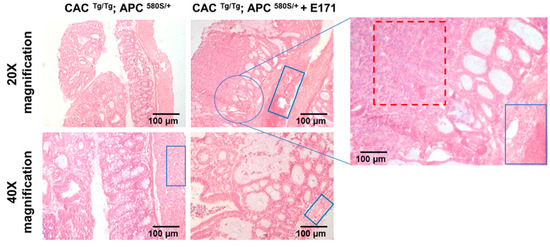 Histopathological analysis of tumors in control and E171-treated mice showed well-differentiated adenocarcinomas. The mice exposed to E171 additionally showed enhanced hyperplasia in the epithelial cells as well as epithelial cell infiltration in the muscle layer of the adenocarcinomas. Red squares—epithelial cell hyperplasia and anaplasia; blue squares—epithelial cell infiltration into the muscle layer (hyperplasia).