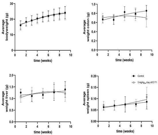 Average bodyweight and organ weight of Tg mice following intragastric exposure to 5 mg/kgbw/day of E171 over time (n = 78). One mouse was euthanized ahead of the schedule due to rectal prolapse. A second mouse from the control group was ruled as an outlier due to severe tumor formation. These mice were not included in the graphs. After euthanasia, colon, liver, and spleen were weighed. The black data series corresponds to the control mice exposed to sterile water and the grey data series is attributed to the mice exposed to 5 mg/kgbw/day of E171 via intragastric administration. Data is presented as the mean +/− standard deviation of each timepoint.