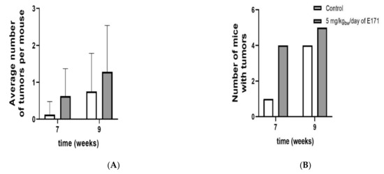 The CACTg/Tg;APC580S/+ Tg mouse model was used to study tumor formation in the colon after exposure to 5 mg/kgbw/day of E171 by intragastric administration for 9 weeks. Our experiment showed no effect on the bodyweight of these Tg mice, following the exposure to E171 (Figure 3). Similarly, no significant effect on organ weight of the colon, liver, or spleen was detected (Figure 3). However, Figure 4A shows a tendency that the average number of tumors per mouse increased after 7 and 9 weeks of exposure. Additionally, a statistically nonsignificant increase in the number of mice with tumors was registered after E171 exposure, when compared to the controls (Figure 4B).