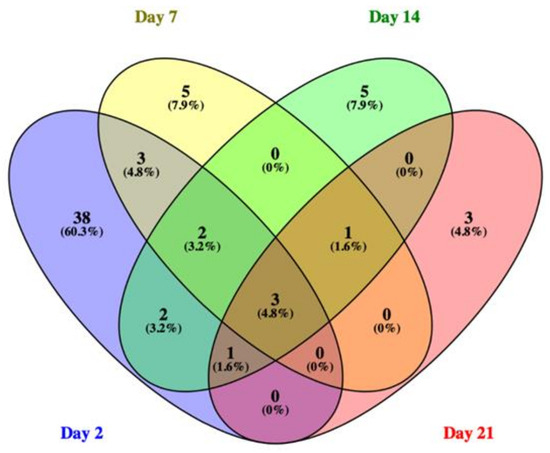 The Venn diagram shows the number of 5% FDR-corrected DEGs (absolute FC ≥ 1.5 and q-value < 0.05) and their overlap after the exposure to 1 mg/kgbw/day of E171 at 2, 7, 14, and 21 days. The three genes, Dbp, Nr1d1, and Nr1d2, were continuously modulated at all timepoints. After 2, 7, and 14 days of exposure, Arntl/Bmal1 and Nfil3 were modulated. Rorc was modulated at days 7, 14, and 21, while Nfkbiz was modulated after 2, 14, and 21 days of exposure to 1 mg/kgbw/day of E171.