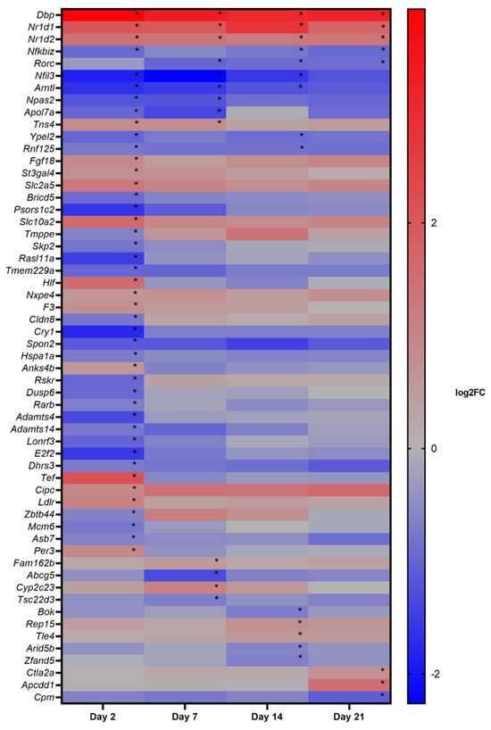 Heatmap of all genes that were differentially expressed (absolute FC ≥ 1.5, q-value < 0.05) at one or more timepoints, following the exposure to 1 mg/kgbw/day of E171. The rows represent the differentially expressed genes, while the columns represent the expression value for the timepoints 2, 7, 14, and 21 days. Red and blue colors indicate the log2FC: red stands for upregulation and blue for downregulation of the gene, in comparison with its time-matched control. The order of genes is based on the number of timepoints a gene was significantly differentially expressed (marked by *).