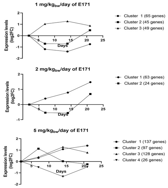 The short time-series express miner (STEM) analysis was performed with the STEM tool developed by Ernst and Bar-Joseph [29]. STEM is an algorithm that compares short time-series gene expression data and clusters gene expression patterns over time, which helps to visualize and analyze microarray data in regard to the directionality of genes [29]. The analysis was performed with the log2FC expression values of all genes processed by LIMMA analysis and was grouped per dosage (1, 2, and 5 mg/kgbw/day of E171) over the 4 timepoints (2, 7, 14, and 21 days). The gene annotation source was set on Mus musculus. No additional cross-references, no gene location, and no normalization settings were used. The STEM clustering method was set on a maximum of 50 model profiles per analysis. Each expression of a gene was compared to the previous timepoint, and the maximum unit change in the model profiles between the timepoints was set to 2. Significance (p-value < 0.05) was calculated by comparing the actual number of genes per cluster to the expected number of genes per cluster by using Bonferroni correction [29]. The clustered genes that were assigned to statistically significant profiles were grouped by biological function (color) and combined into a single graph. The genes in these obtained graphs/clusters were analyzed with ORA via CPDB, as described in the previous section.