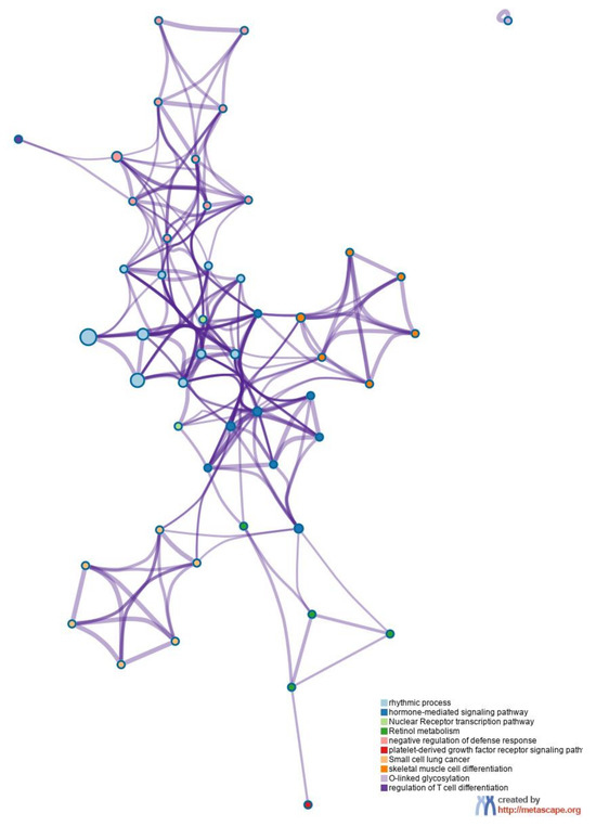 Metsacape heatmap enrichment analysis identified similar alterations of genetic pathways as previously described by ORA and STEM analysis. Figure 9 shows the enrichment heatmap of the significant (p-value < 0.05) pathways that were identified when analyzing all DEGs (absolute FC ≥ 1.5 and q-value < 0.05) after the exposure of Tg mice to 1 mg/kgbw/day of E171 for 2, 7, 14, and 21 days. These pathways included rhythmic processes, hormone-mediated signaling pathways, nuclear receptor transcription pathways, retinol metabolism, negative regulation of inflammatory response, platelet-derived growth factor receptor signaling pathways, small cell lung cancer, muscle tissue development, O-linked glycosylation, and regulation of T-cell differentiation. Figure 10 shows the functional network relationships between the identified biological processes and their interactions, indicating the connection between genes and the pathways they are involved in through nodes.