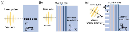 Schematics of simulation model. (a) Bulk fused silica; (b) MLD mirror; (c) MLD grating. D is the grating period. a/D is the duty cycle. d is the etch depth.
