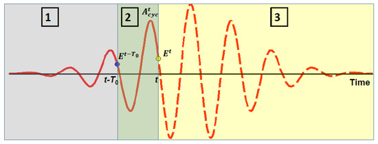 A sketch of time profile of electric field at a fixed space point. Time point t is the current point where electric field is evaluated from the FDTD equations. Areas 1 and 2 contain the time points where electric field has been evaluated by the FDTD method. Area 3 contains the “future” time points where electric field will be evaluated at later steps. Area 2 is the full cycle that is the nearest to the current time point t.
