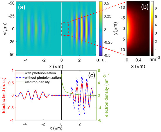 (a) Electric field distribution normalized to the amplitude of the incident pulse after the pulse leaves the target; (b) Electron density in the marked area; (c) Lineouts of electric fields (left panel) and electron density (right panel) with and without photoionization along y = 0. The vertical lines in (a,c) denote the air-and-target interface. The space on the left is air. The horizontal axes and scales in (a,c) directly correspond to each other.
