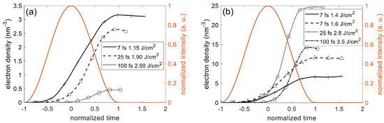 Electron density evolution for different pulse durations at LID thresholds (a) and ablation thresholds (b) based on measurements in [27,47]. The orange curve represents the intensity profile of the laser pulse and the time is normalized by the pulse duration. The crosses, squares, and circles represent the simulation data points for the 7 fs, 25 fs, and 100 fs pulses, respectively. The triangles also represent the simulation data points for the 7 fs pulse. The lines through the simulation points are merely to guide the eye.
