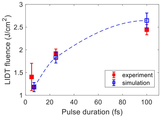 In this paper, we apply the energetic criterion to precisely benchmark our model. Assuming that most absorbed energy is deposited within a depth commensurate with the crater depth caused by pulses at the ablation threshold, the absorbed energy density can be estimated by dividing the cumulative absorbed fluence by the crater volume. The atomic force microscopic measurements in Ref. [47] show that the crater depth is 50, 70, and 80 nm at the ablation threshold for 7 fs, 25 fs, and 100 fs pulses, respectively. The crater profiles are then used to estimate crater volumes. Using the calculated cumulative absorbed fluence in Figure 4b, we then calculated the absorbed energy density and evaluated the LID thresholds by comparing with . Figure 6 shows that the simulation results are in excellent agreement with the reported experimental measurements. The deviation between them slightly increases as the pulse duration increases, but the simulation and experimental tolerance ranges still overlap with each other for all the pulse durations considered here.