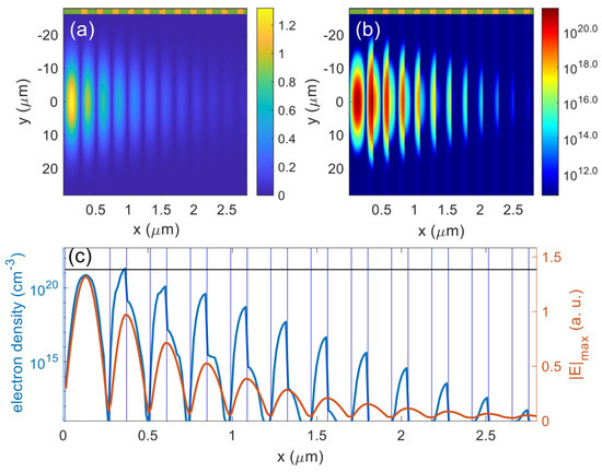 In this simulation, a 50 fs pulse (R = 5.3 μm) is incident upon the MLD grating from the upper left at AOI = 38° (see Figure 1c). The material and pulse parameters are introduced in Section 2.1. Compared to the simulation results of the MLD mirror, in the MLD grating is much higher (see Figure 8a), especially at the grating pillars and top layers in the thin-film stack. Therefore, the critical density is achieved at a much lower fluence, 0.18 J/cm2, and the LID threshold of the MLD grating is estimated as 0.17 J/cm2. A 10 × 10 nm2 spatial grid is used here to obtain convergent simulation results.