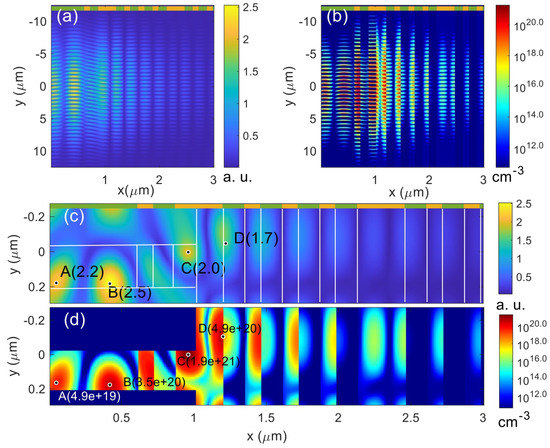 Similarly, the electron density distribution is correlated with , but HfO2 is more rapidly ionized than SiO2. As shown in Figure 8c,d, the maximum occurs at the top of pillars made of SiO2 (see point B in Figure 8c), while the maximum electron density locates in the bottom of pillars made of HfO2 (see point C in Figure 8d). The second peak of electron density is at the interface between the first HfO2 and SiO2 layers (see point D in Figure 8d). Therefore, the simulation suggests that, at the LID threshold, damage is initiated most likely at the bottom of pillars at the side facing the incident pulse. At slightly higher fluences, damage at the bottom and top of pillars, and deformation at the first HfO2/SiO2 interface can occur at the same time. Since the grating pillars and the top layers are subjected to the highest field enhancement, high-bandgap dielectrics are better candidates for the grating pillars and the top layers where the field enhancement is highest.