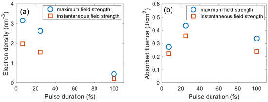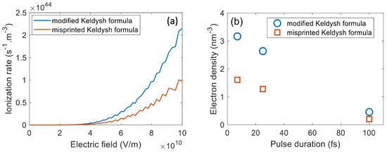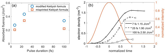 Figure 9 shows that the photoionization rate and electron density obtained from the unmodified equations are almost half of those obtained from Equations (16) and (17). Especially, by using the uncorrected formulae, the electron density is lower than the critical density even for all pulse durations at the LID thresholds. Figure 10a shows that the misprinted equation results in a lower cumulative absorbed fluence, and this impact increases as the pulse duration becomes longer. The electron density during the interaction in Figure 10b, which is calculated from unmodified Equations (16) and (17), is much lower than the corrected result in Figure 5a.