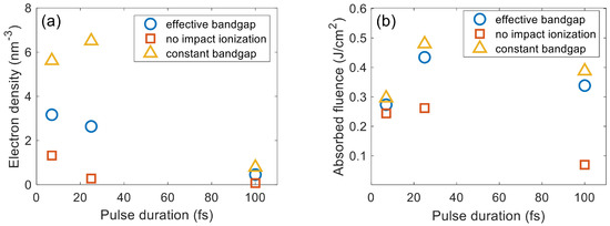 Comparison of (a) electron density and (b) absorbed fluence calculated from the simulation without impact ionization and the simulations with ionization but using effective and constant bandgaps. The pulse parameters are the same as those in Figure 9.