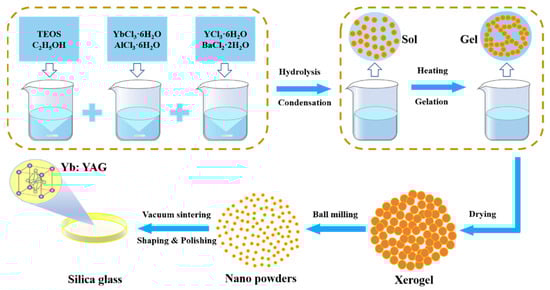 Low-nanocrystal-content doping is considered an effective method for obtaining high optical transmittance in silica-based nanocrystalline glass. It is necessary to reduce the doping content of Al2O3 and Y2O3 as these are the main components of YAG crystals. The 0.14Yb2O3-0.5Y2O3-0.87Al2O3-0.1BaO-98.39SiO2 (YABS, in mol%) and 0.14Yb2O3-0.5Y2O3-0.87Al2O3-98.49SiO2 (YAS, in mol%) glass were prepared using a modified sol–gel method [23] that was able to prepare glass of a large size, high homogeneity, and precise composition control, which facilitated the accurate analysis of the spectral and structural properties. BaO was introduced as a nucleating agent into the YABS glass to induce phase separation and crystallization of the glass [24], while a nucleating agent was not introduced into the YAS as a comparison sample. The sample composition test values are listed in Table 1 and the detailed preparation procedure is illustrated in Figure 1. The YbCl3·6H2O (Sigma-Aldrich, St. Louis, MO, USA, 99.998%), AlCl3·6H2O (Sigma-Aldrich, St. Louis, MO, USA, 99%), YCl3·6H2O (Sigma-Aldrich, St. Louis, MO, USA, 99.99%), and BaCl2·2H2O (Sigma-Aldrich, St. Louis, MO, USA, 99.99%) were dissolved in a mixture of tetraethyl orthosilicate (TEOS, Kermel, Tianjin, China) and C2H5OH (Kermel, Tianjin, China) at room temperature, sufficiently stirred to obtain transparent silica sols after hydrolysis and polymerization reactions. Thereafter, the homogeneous gels were obtained by heating to 80 °C for 10 h. The gel was heat-treated at 200 °C in an oxygen environment for 20 h to obtain white dry-gel particles. Thereafter, these particles were granulated by ball mill to obtain a white powder, which was sintered at 1720 °C in a vacuum for 1 h, quenched, and rapidly cooled to obtain a transparent bulk glass that could be satisfied with various tests after proper treatment.