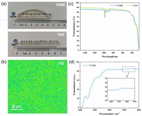 In this study, silica glass of a large size (Figure 2a), high homogeneity (Figure 2b), and precise composition control (Table 1) were prepared by a modified sol–gel method [23]. The transmittance curves of the YABS and YAS glass are plotted in Figure 2c; both curves showed a transmittance greater than 85% in the visible and near-infrared regions.