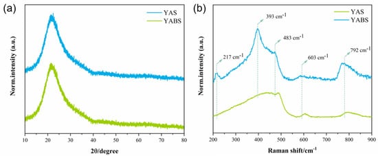(a) XRD patterns and (b) Raman spectra of YABS and YAS glass.